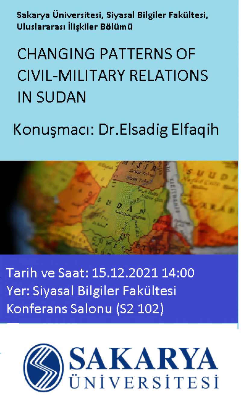 Dr. Elsadig Elfaqih tarafından "Changing patterns of civil-military relations in Sudan" isimli konferans 15.12.2021 Çarşamba 14:00'da Siyasal Bilgiler Fakültesi Konferans Salonunda yapılacaktır.