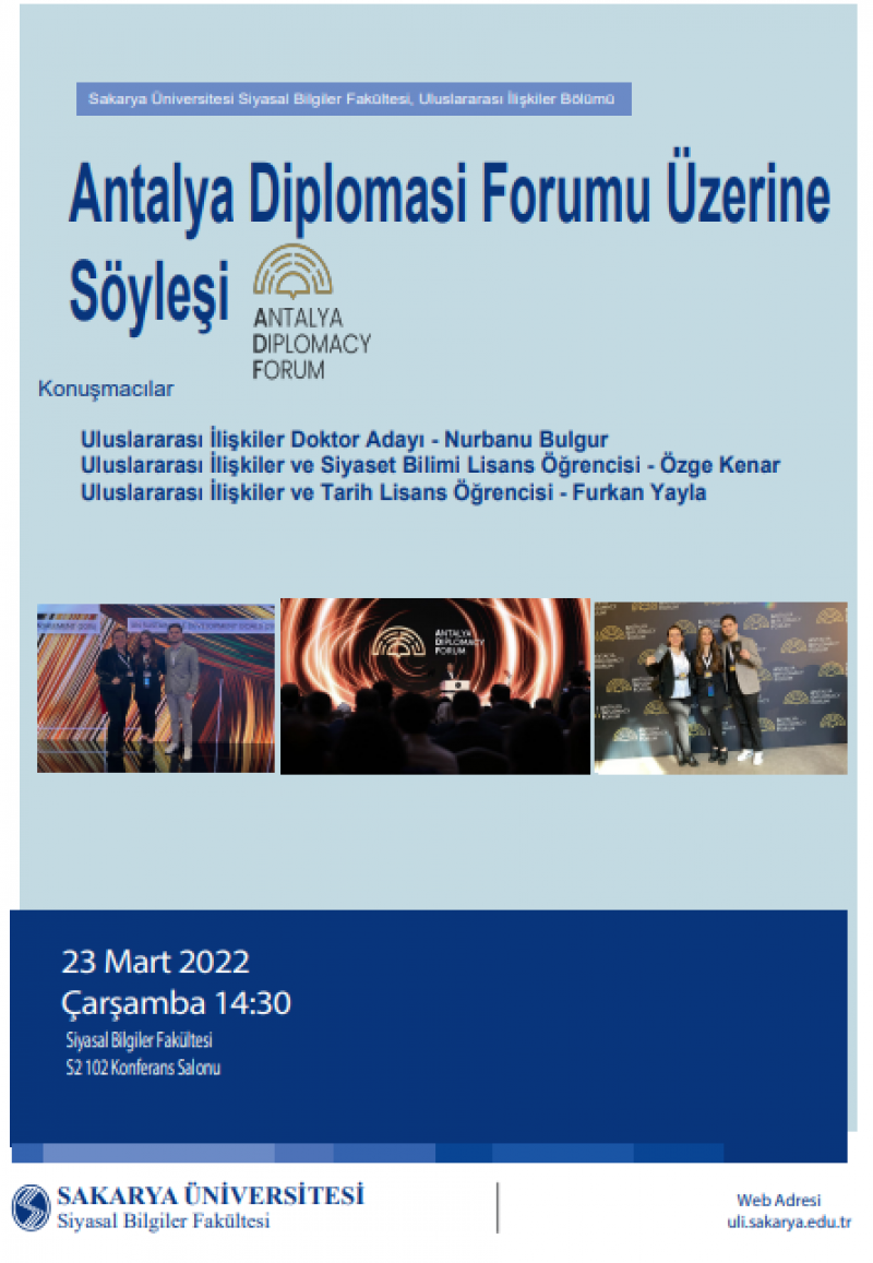 Antalya Diplomasi Forumu üzerine yapacağımız söyleşi 23.03.2022 Çarşamba günü saat 14:30'da Siyasal Bilgiler Fakültesi S2 102 Konferans Salonu'nda gerçekleştirilecektir.