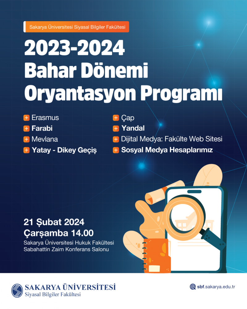 Fakültemiz öğrencilerine yönelik 2023-2024 Bahar Dönemi Oryantasyon Programı düzenlenmesi planlanmıştır. Afişteki bilgiler, etkinliğin içeriği ve diğer önemli detaylar hakkında size rehberlik edecektir.