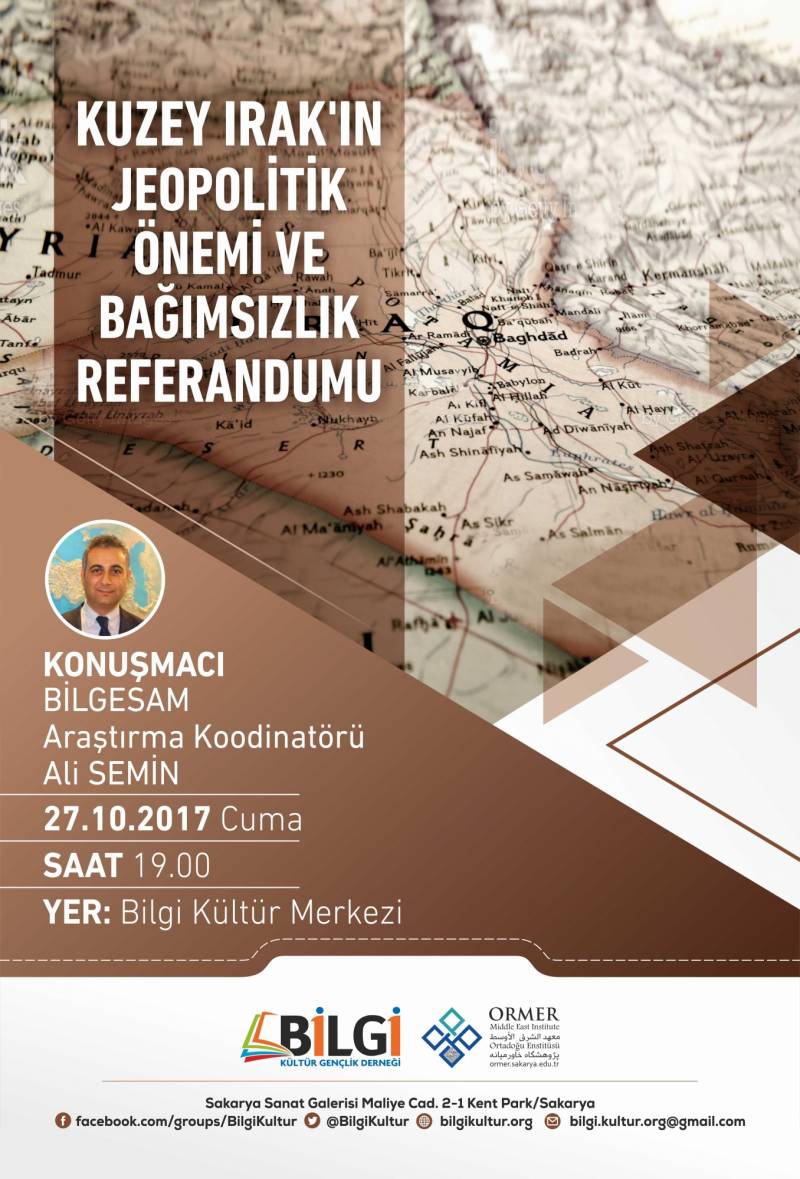 Bilgesam'dan Ortadoğu uzmanı araştırmacı Ali SEMİN'in "Kuzey Irak'ın Jeopolitik Önemi ve Bağımsızlık Referandumu" başlıklı sunumuna bölümüzün bütün öğrencileri davetlidir.